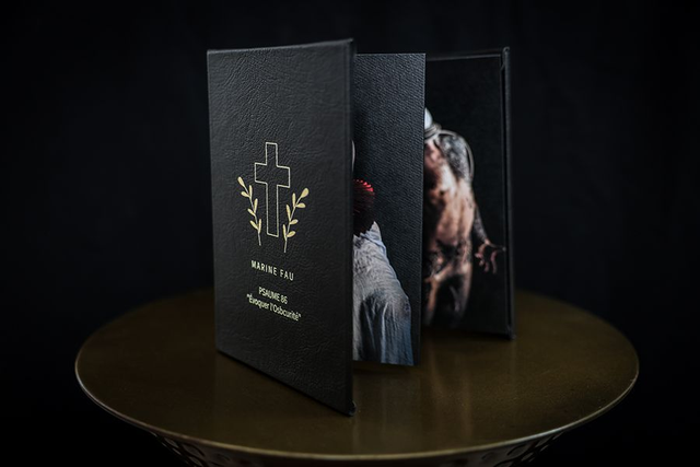 À la fois intime et décoratif, il peut être précieusement conservé dans sa pochette en simili cuir ou exposé sur une bibliothèque, ouvert pour révéler quatre photographies en dialogue avec le texte sacré du Psaume 86.